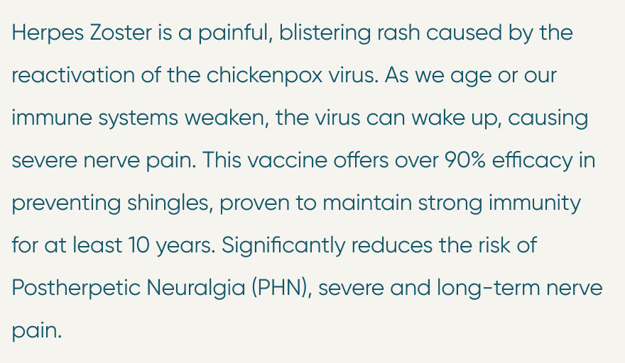 Adults aged 50 years and older | Adults aged 18 years and older with weakened immune systems or who are at a higher risk of infection due to disease or medical treatment (e.g., cancer patients, individuals with HIV, patients with autoimmune diseases, etc.) | Patients who have previously had shingles (herpes zoster), or those who have received the older live-attenuated shingles vaccine | Individuals with a past history of chickenpox (varicella) | Adults with chronic conditions such as diabetes, high blood pressure (hypertension), chronic obstructive pulmonary disease (COPD), or heart disease
