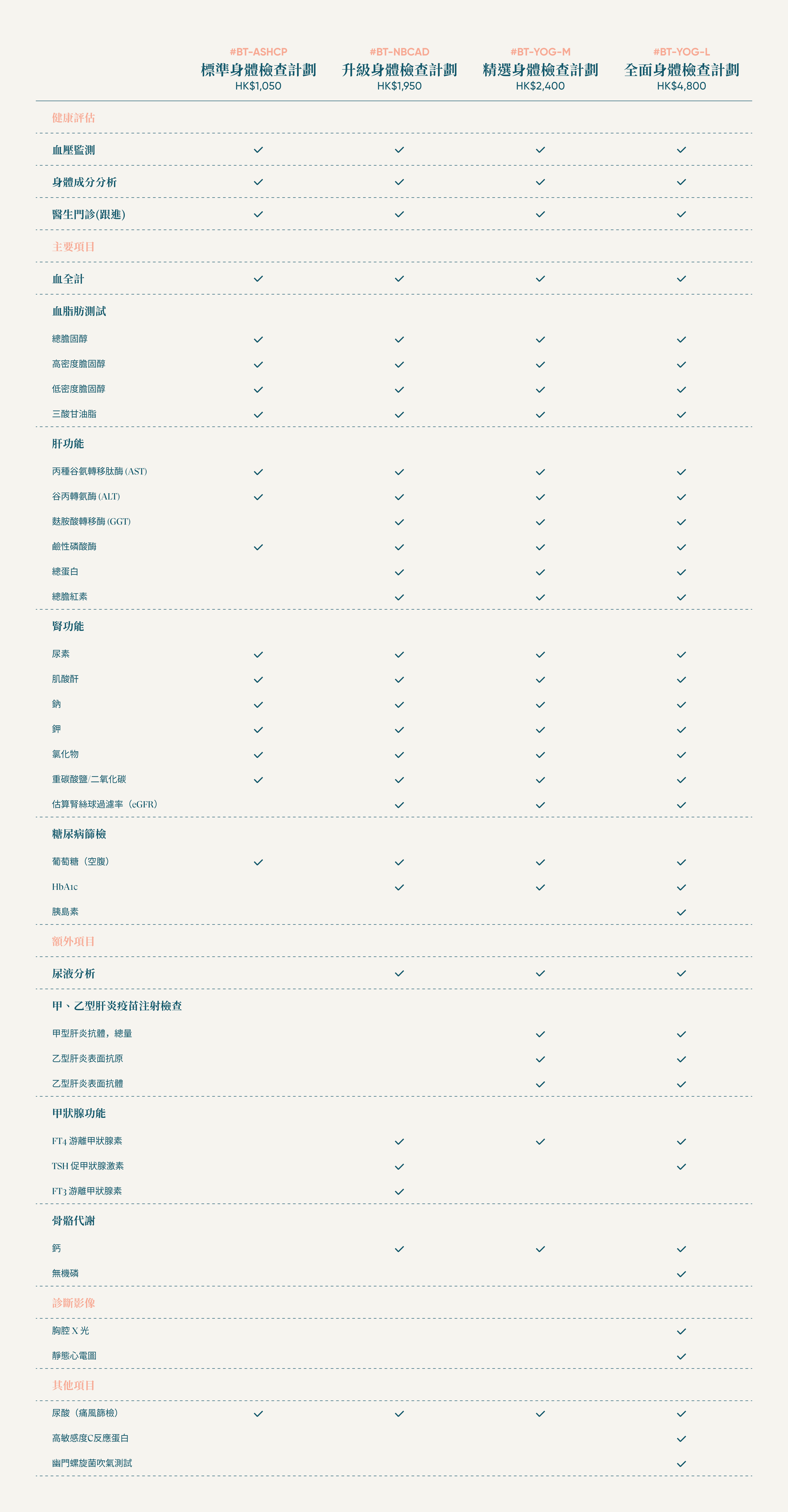 全面身體檢查計劃是詳細的全身健康篩檢服務,涵蓋多個器官系統、血液指標及身體評估,適合想詳細全面了解健康狀況的人士,找出問題所在及潛在健康風險,從而對症下藥。