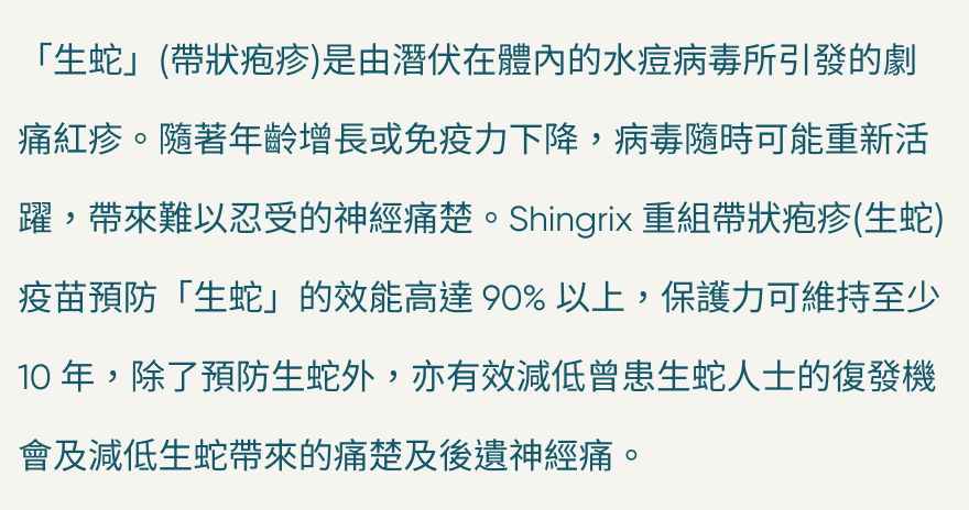 50 歲或以上人士|18 歲或以上免疫力較弱或因疾病/治療而有較高感染風險的人士(如癌症患者、HIV 感染者、自體免疫疾病患者等)|曾經「生蛇」的病人(患過帶狀疱疹),或曾接種過舊款的活性減毒生蛇疫苗|曾患水痘人士|患有糖尿病、高血壓、慢性阻塞性肺病疾病、心臟病的成人